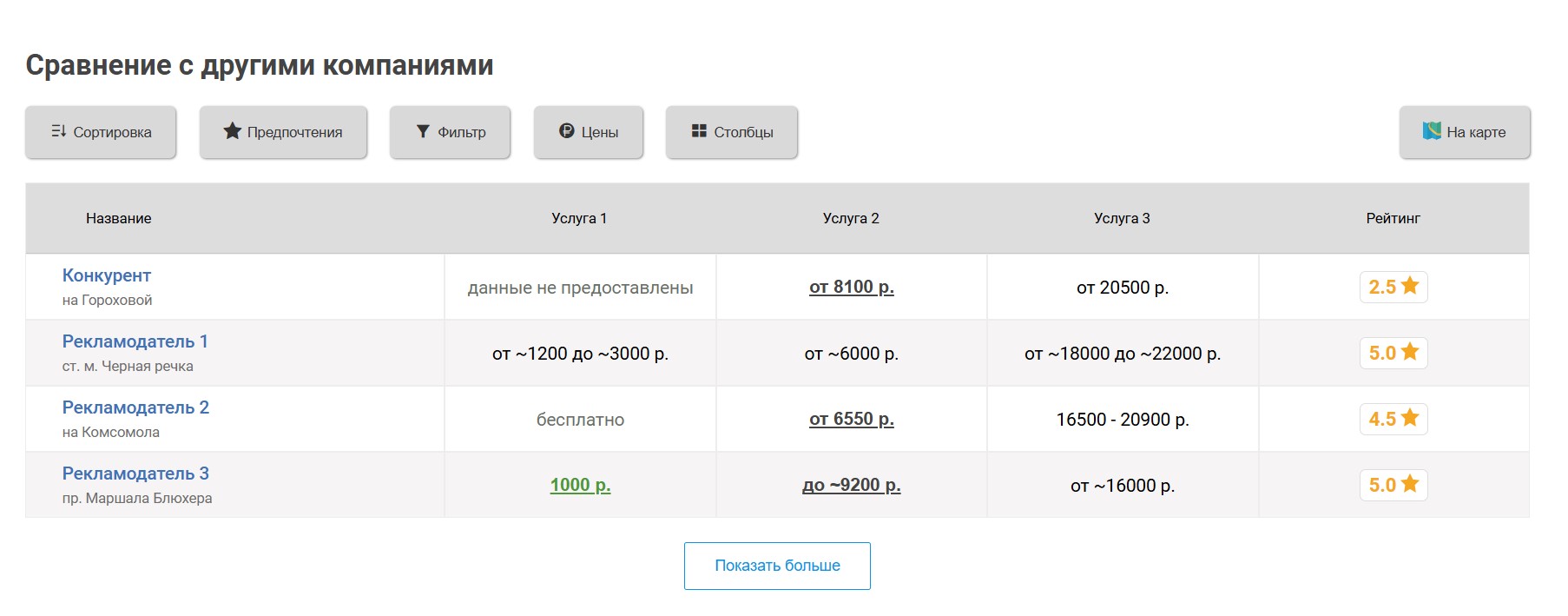 типографий, продвигаемая типография попадёт к ним в таблицу «Сравнение по ценам», которая выглядит следующим образом: